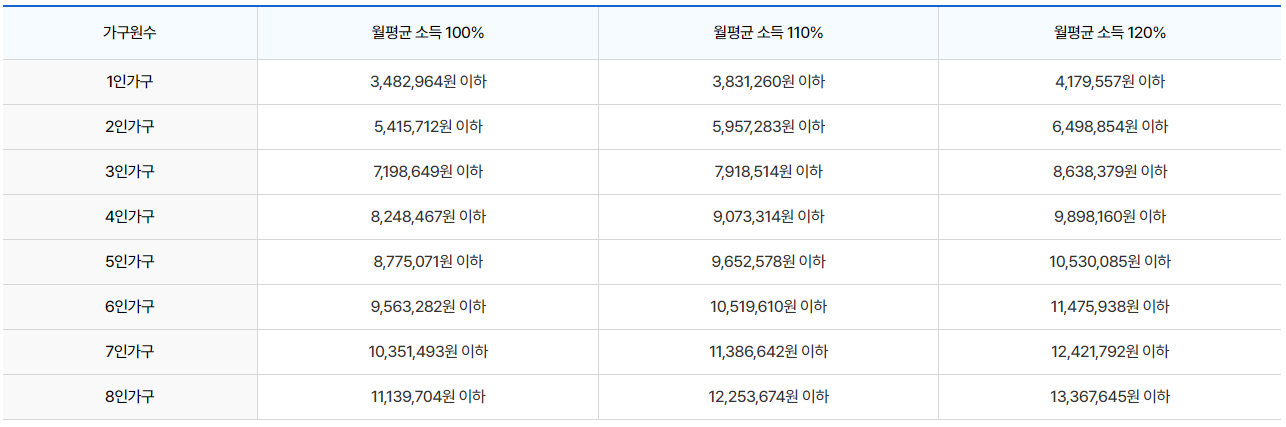 | 신혼부부 | 혼인기간 7년 이내 또는 만 6세 이하 자녀 보유, 무주택세대구성원 | 전년도 도시근로자 가구당 월평균 소득의 100% 이하 (맞벌이 120% 이하) |
